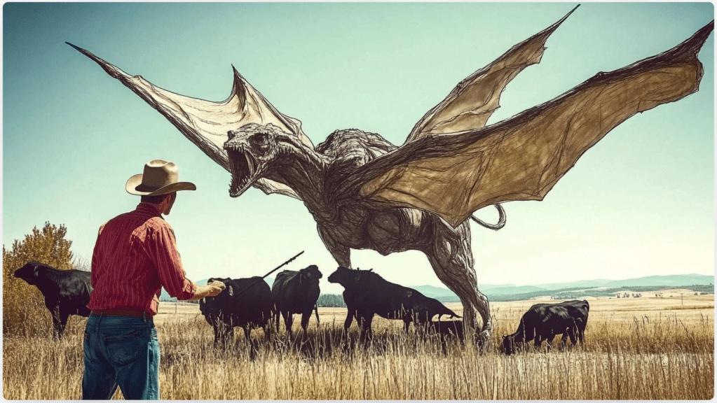 A fun feature of Midjourney is that even when it misses the mark, its efforts can be valuable for other projects. The image above seems to show how the famed “thunderbird” might have terrorized ranchers — and could find use in a Weird West idea I’m developing. For the record, here’s the prompt that generated this image…